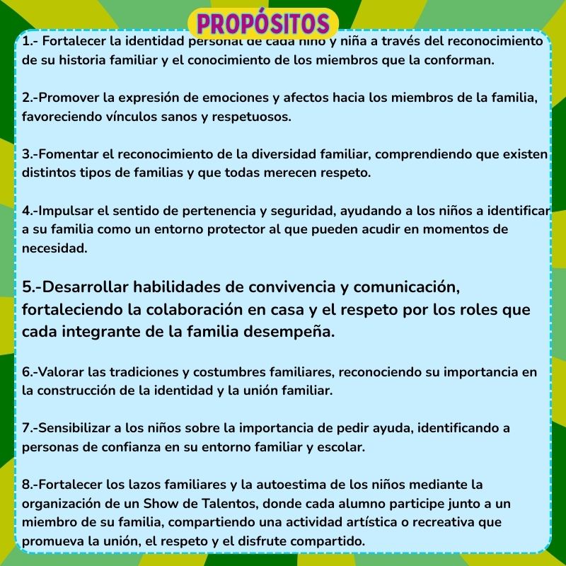8.-Fortalecer los lazos familiares y la autoestima de los niños mediante la organización de un Show de Talentos, donde cada alumno participe junto a un miembro de su familia, compartiendo una actividad artística o recreativa que promueva la unión, el respeto y el disfrute compartido.